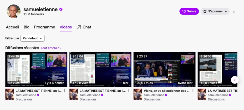On peut noter l’arrivée de France Télévisions avec une émission quotidienne de Samuel Etienne, présentateur sur France 3 et animateur de Questions pour un Champion, intitulée « La Matinée Est Tienne » qui réunit plus 10 000 spectateurs sur le thème de l’actualité.